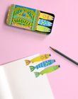Fishing for a little something to write on or a great gift for a tinned food enthusiast? Try these fin-tastic sardine sticky notes—they look good enough to eat but are made for jotting down all those important thoughts. Three die-cut notepads with 180 pages each are tucked into a cool retro-design tin with a sliding lid. Once the notes are done, the tin makes a terrific keepsake—the perfect catch for bits and bobs.