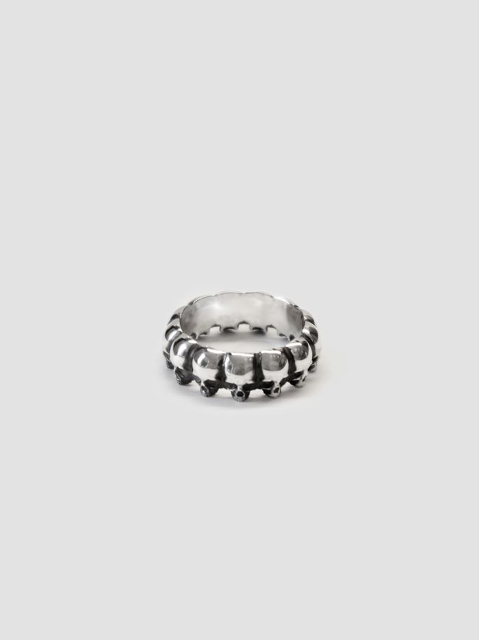 Handmade, .925 sterling silver, band of skulls ring. Inspired by the nursery rhyme “Ring a Ring o’ Roses”.