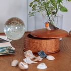 Crafted from cherry wood, each box showcases the timber's distinctive warm reddish-brown tones and unique grain patterns. Natural resin spots and darker streaks give every piece its own character, while the hand-carved surface creates beautiful light and shadow effects you'll want to touch. The traditional construction technique draws inspiration from shrink pots. This clever approach uses the wood's natural movement to hold everything together without a single nail or screw. The detailed robin perched on top isn't just decorative – it makes the perfect little handle for opening your box. We've finished each piece with oil to enhance the wood's natural beauty. With proper care and the occasional oil treatment, your box will develop a rich patina that only gets more beautiful with age.